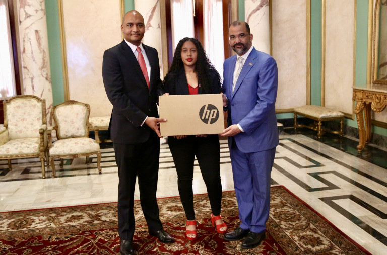 Le acompaña, el presidente del Instituto Dominicano de las Telecomunicaciones (INDOTEL), Nelson José Guillén.