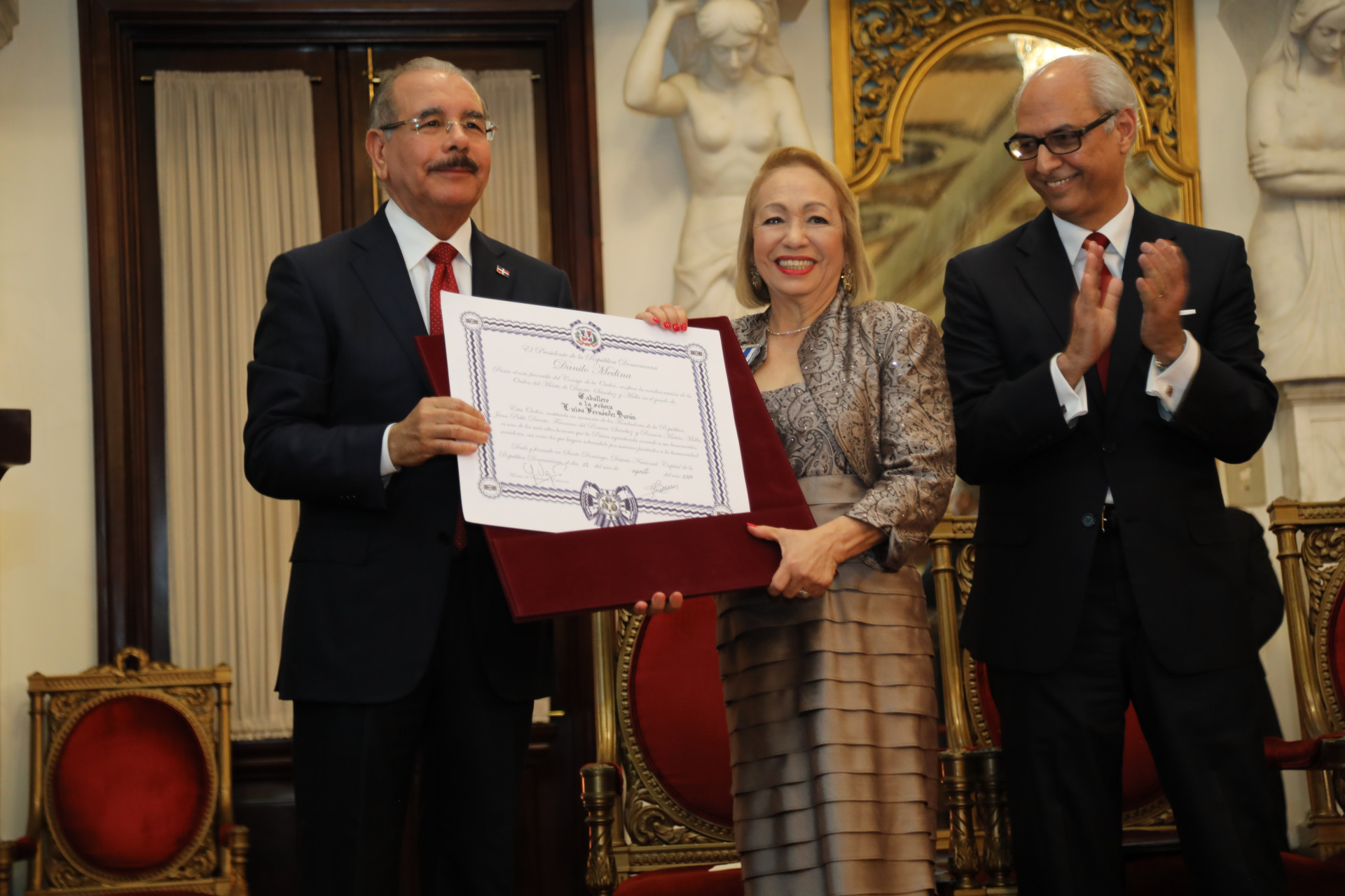 El presidente Danilo Medina impuso la Orden del Mérito de Duarte, Sánchez y Mella en el Grado de Caballero a la directora del Consejo Nacional de Zonas Francas de Exportaciones (CNZFE), Luisa Fernández, por sus aportes a la sociedad.