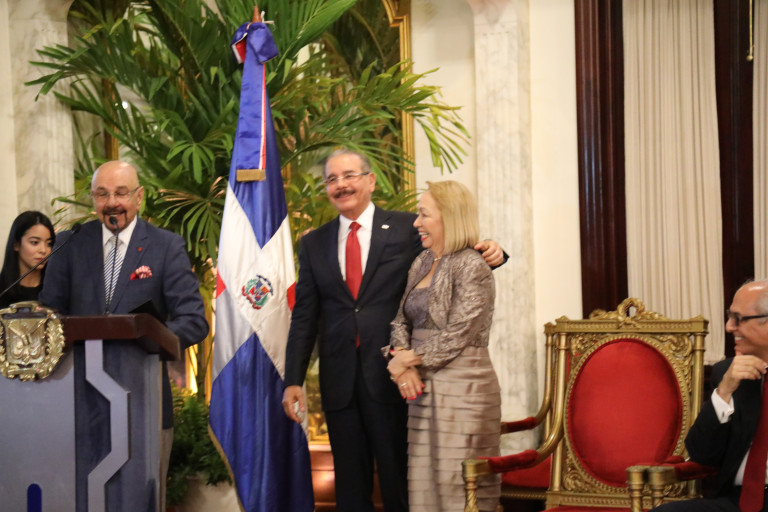 El presidente Danilo Medina impuso la Orden del Mérito de Duarte, Sánchez y Mella en el Grado de Caballero a la directora del Consejo Nacional de Zonas Francas de Exportaciones (CNZFE), Luisa Fernández, por sus aportes a la sociedad. Foto: Luis Ruiz Tito/Presidencia República Dominicana Notas de prensa: presidencia.gob.do/noticias/gran-parte-del-crecimiento-de... presidencia.gob.do/noticias/danilo-medina-encabeza-celebr...