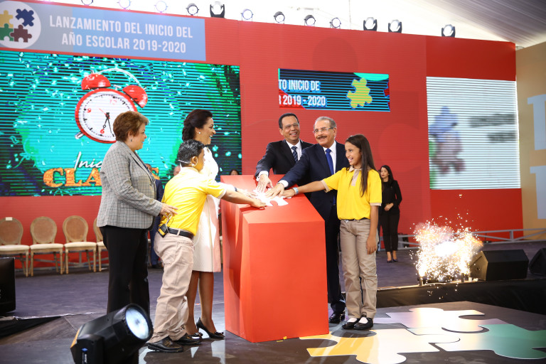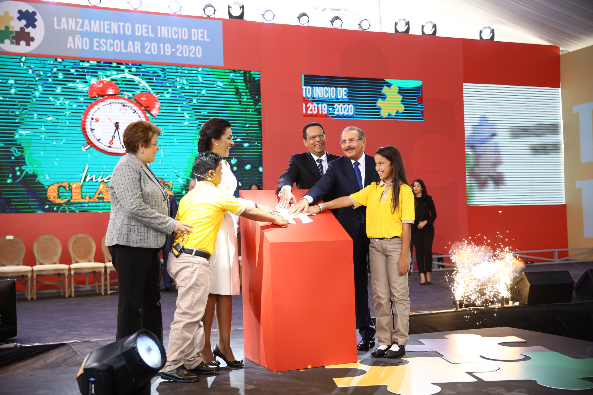 Inició hoy el año escolar 2019-2020, para casi tres millones de estudiantes de todo el país, desde un emotivo acto encabezado por el presidente Danilo Medina, acompañado de la primera dama, Cándida Montilla de Medina, en la provincia Santiago. De forma simultánea, se realizó la entrega del Centro Educativo Especial Eustacia Marte de Fernández, con 23 aulas incorporadas a la Jornada Escolar Extendida (JEE), con capacidad de recibir 630 alumnos que presenten deficiencias auditivas y/o visuales. Foto: Romelio Montero/Presidencia República Dominicana Nota de prensa: presidencia.gob.do/noticias/inicia-ano-escolar-2019-2020-...