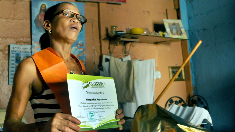 Margarita Agramonte muestra con mucho orgullo su diploma de reconocimiento obtenido durante sus estudios mediante el Plan Nacional de Alfabetización Quisqueya Aprende Contigo.