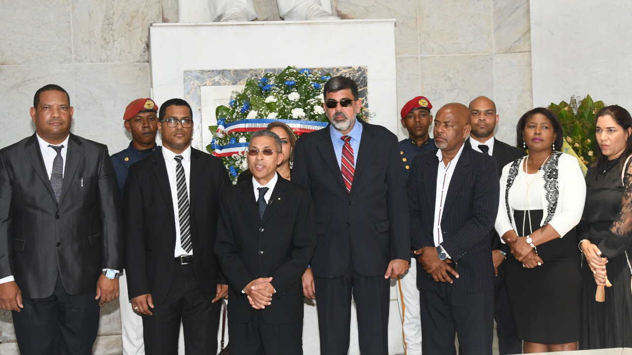 El director general de Promese/Cal, Enriquillo Matos, con funcionarios de la institución, al encabezar la ofrenda floral en el Altar de la Patria, como parte de los actos programados.