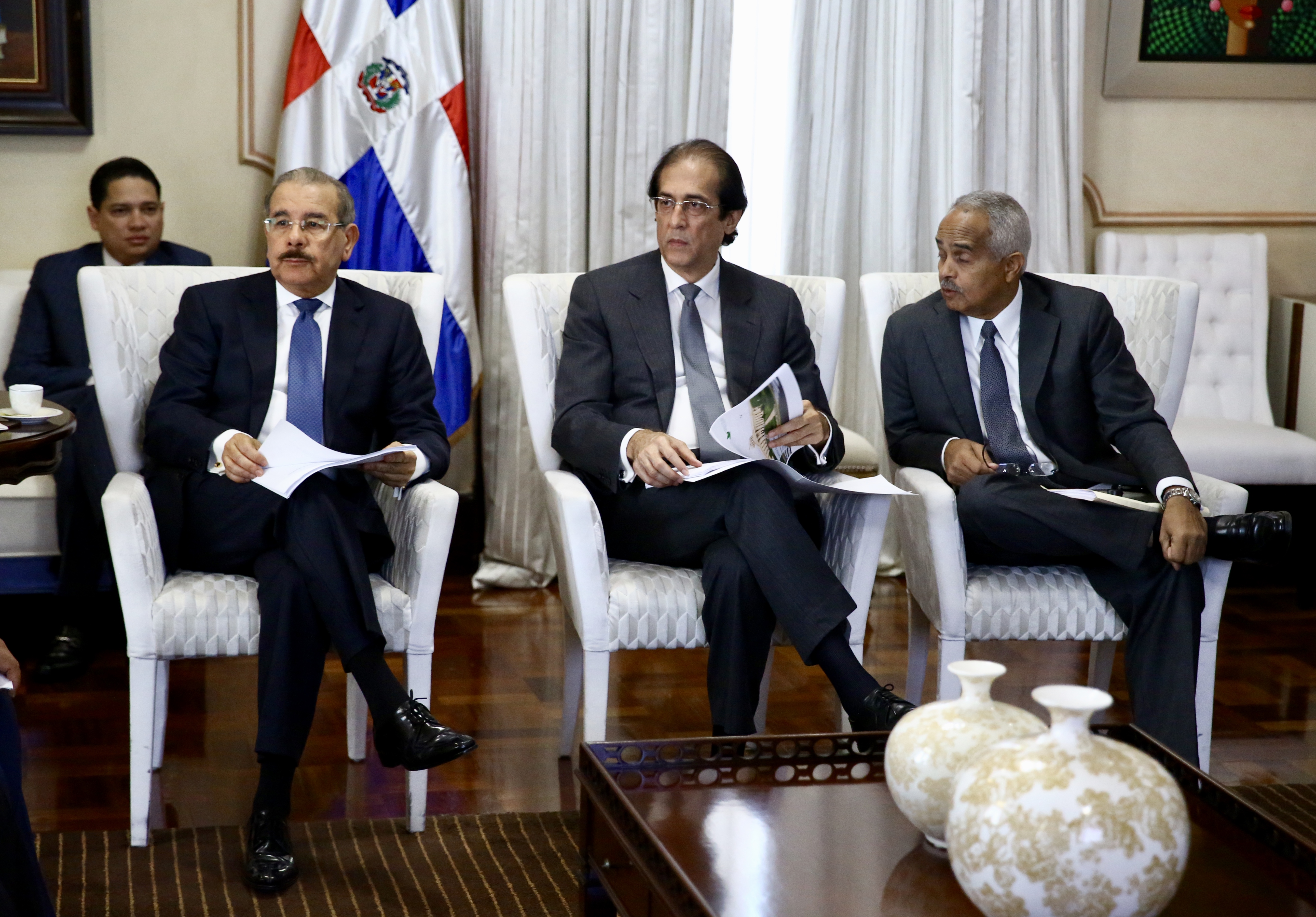 Presidente Danilo Medina, ministro de la Presidencia, Gustavo Montalvo, y ministro de Agricultura, Osmar Benítez, durante el encuentro.
