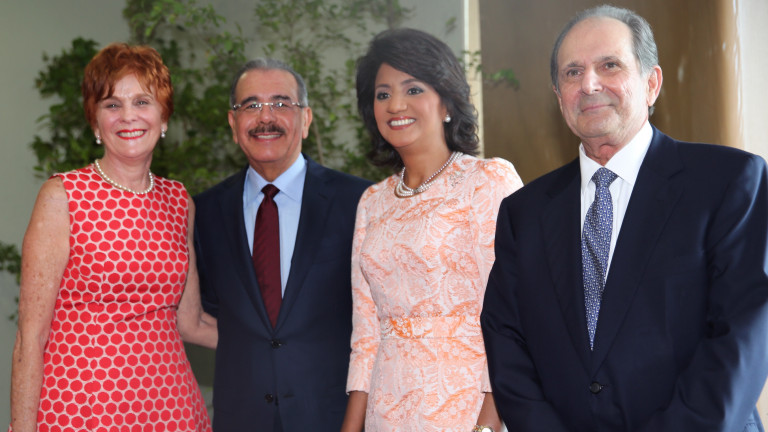El presidente Danilo Medina y su esposa, Cándida Montilla de Medina, junto al Canciller en funciones, José Manuel Trullols y funcionarios del Ministerio de Relaciones Exteriores del país, durante el cóctel que ofrecieran en su honor.