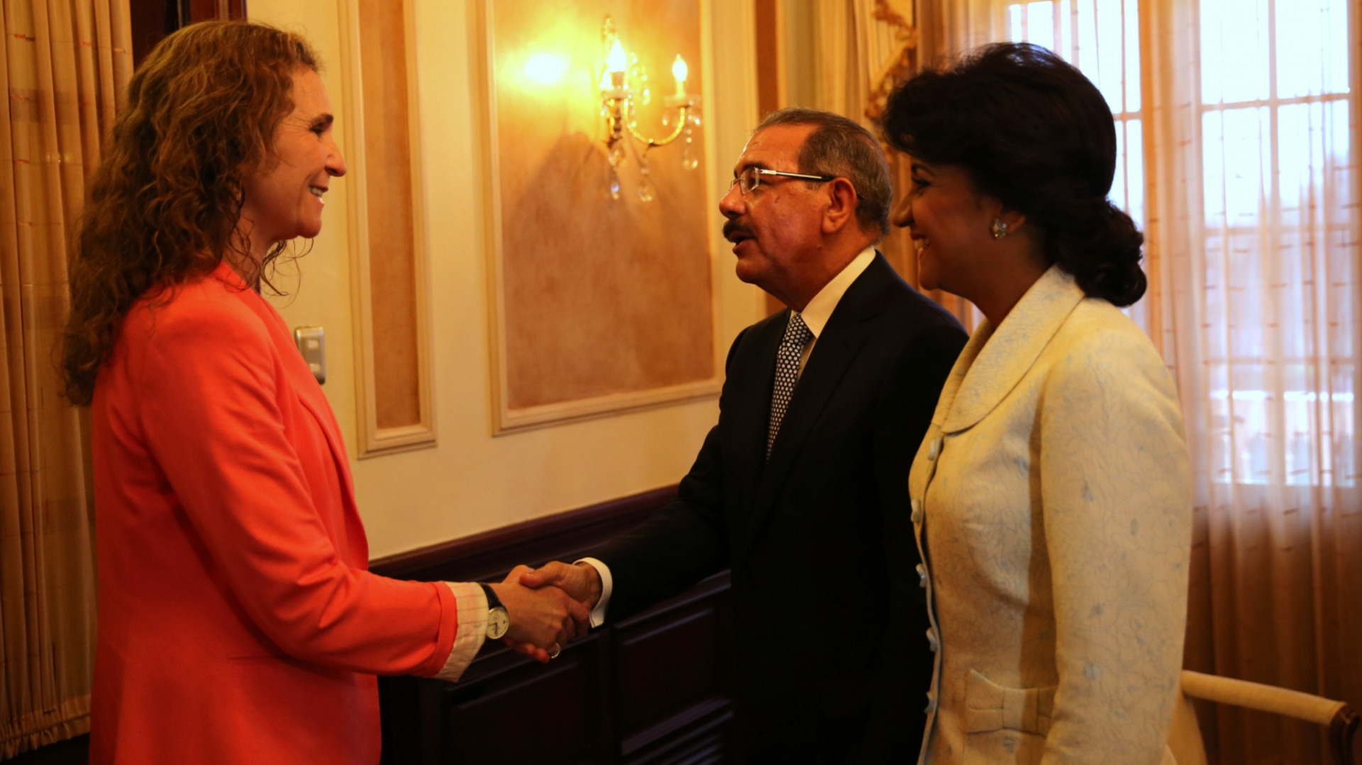 Presidente Danilo Medina y esposa Candida Montilla de Medina durante visita de cortesía de Su Alteza Real, la Infanta doña Elena de Borbón y Grecia junto a integrantes de su delegación, entre los que figura el embajador de España en el país, Jaime Lacadena Higuera; el director de Acción Social de la Fundación Mapfre, Fernando Garrido y el presidente ejecutivo de Mapfre-BHD Seguros en el país, Luis Gutiérrez.