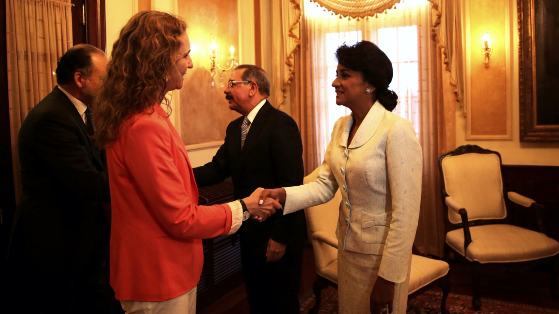 Participación del presidente de la República, Danilo Medina y esposa Candida Montilla de Medina durante visita de cortesía de Su Alteza Real, la Infanta Doña Elena de Borbón y su delegación, con quienes conversaron sobre distintos tópicos relacionados con las actividades de la fundación Mapfre-BHD Segursos y las políticas sociales del Gobierno dominicano.