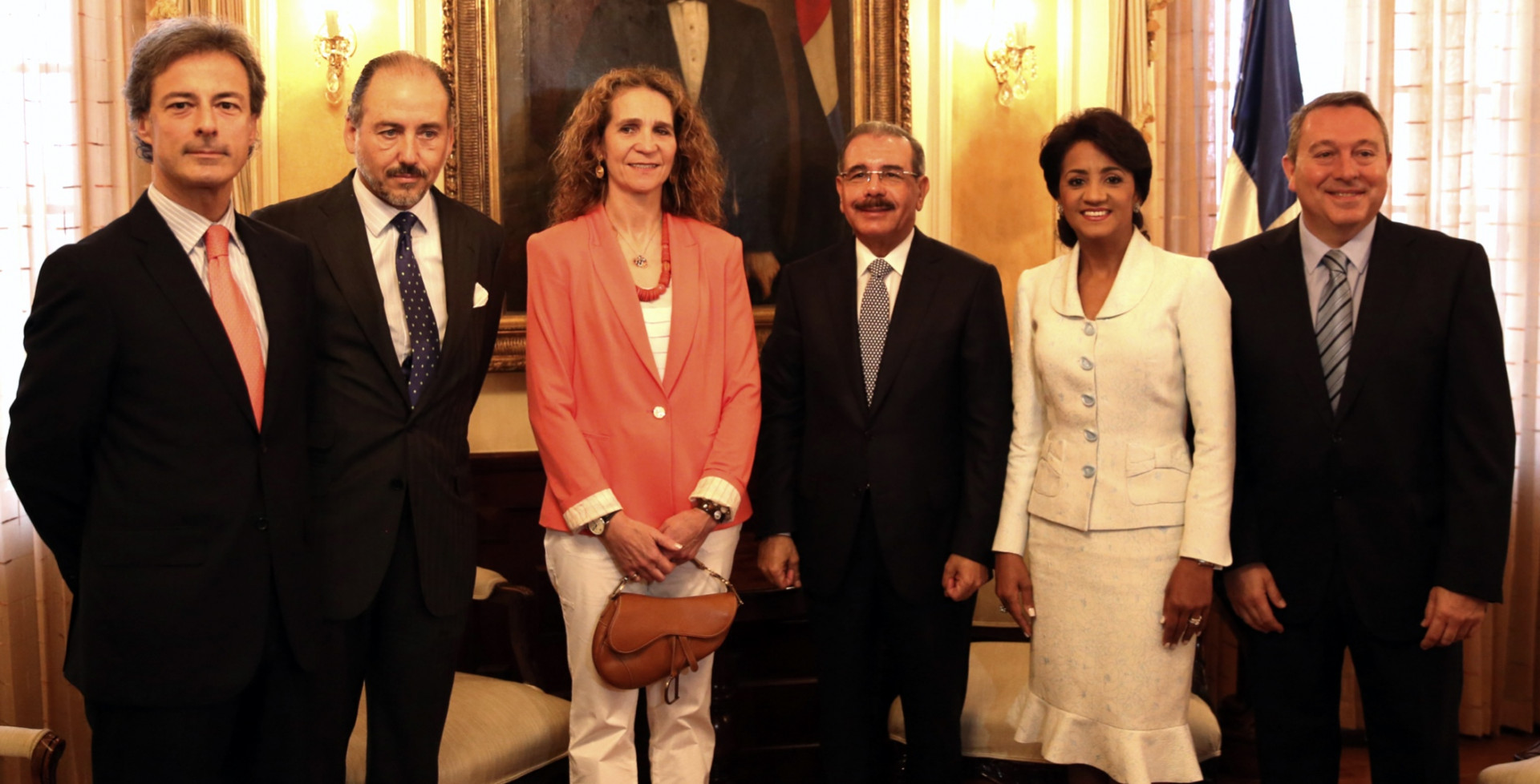 El presidente de la República, Danilo Medina Sánchez y su esposa Cándida Montillla de Medina, se reunieron hoy en el Palacio Nacional con su Alteza Real la infanta Elena de Borbón y Grecia, quien visita el país en su calidad de Directora de Proyectos Sociales y Culturales de la Fundación Mapfre, acompañada de una delegación, en la que figura Jaime Lacadena Higuera, embajador de España en la República Dominicana.