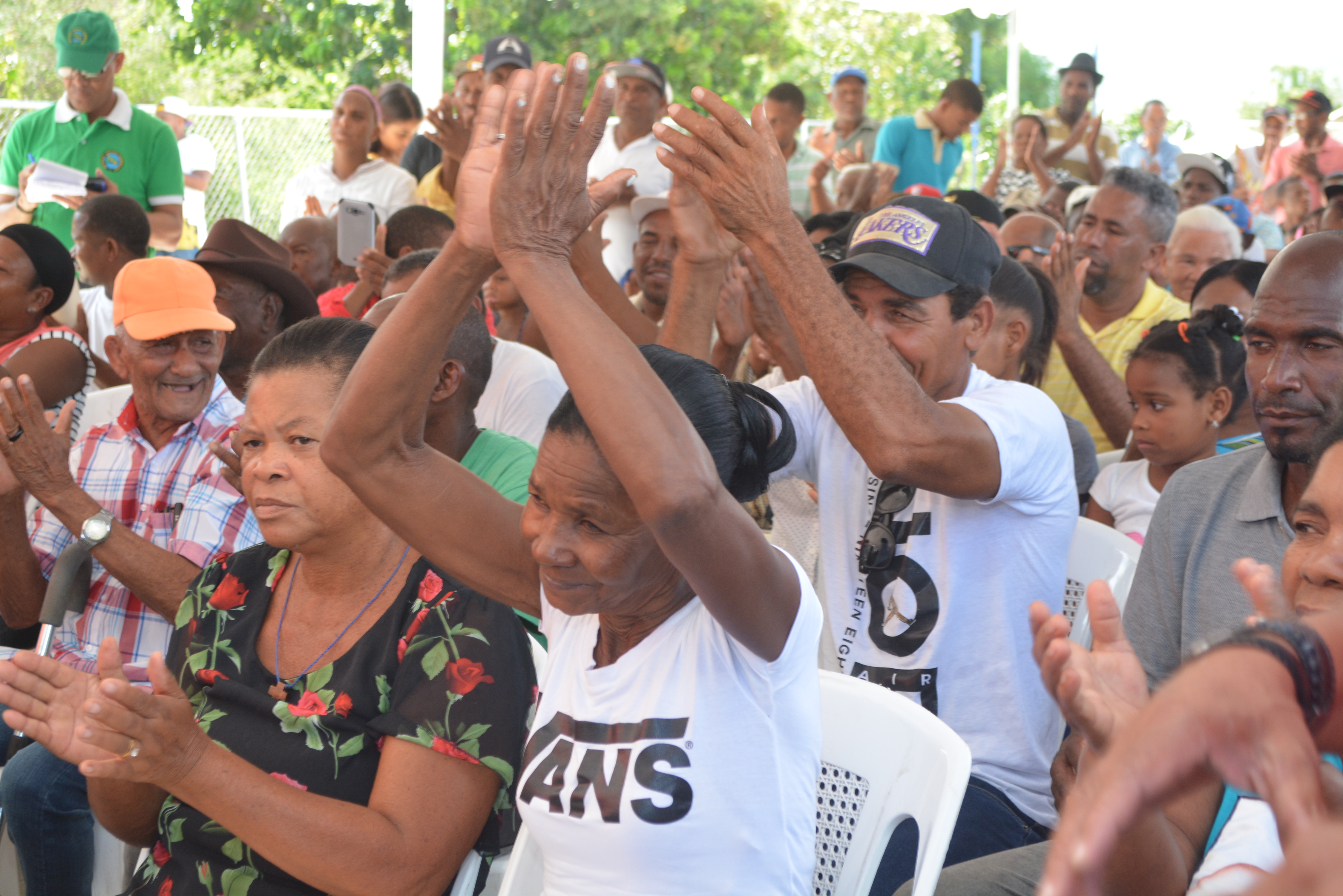 Parceleros presentes en acto de entrega de un camión, un tractor con su rastra y 700 quintales de abono a parceleros de la Asociación de Productores de Orégano Grande, en Las Yayas, Azua.