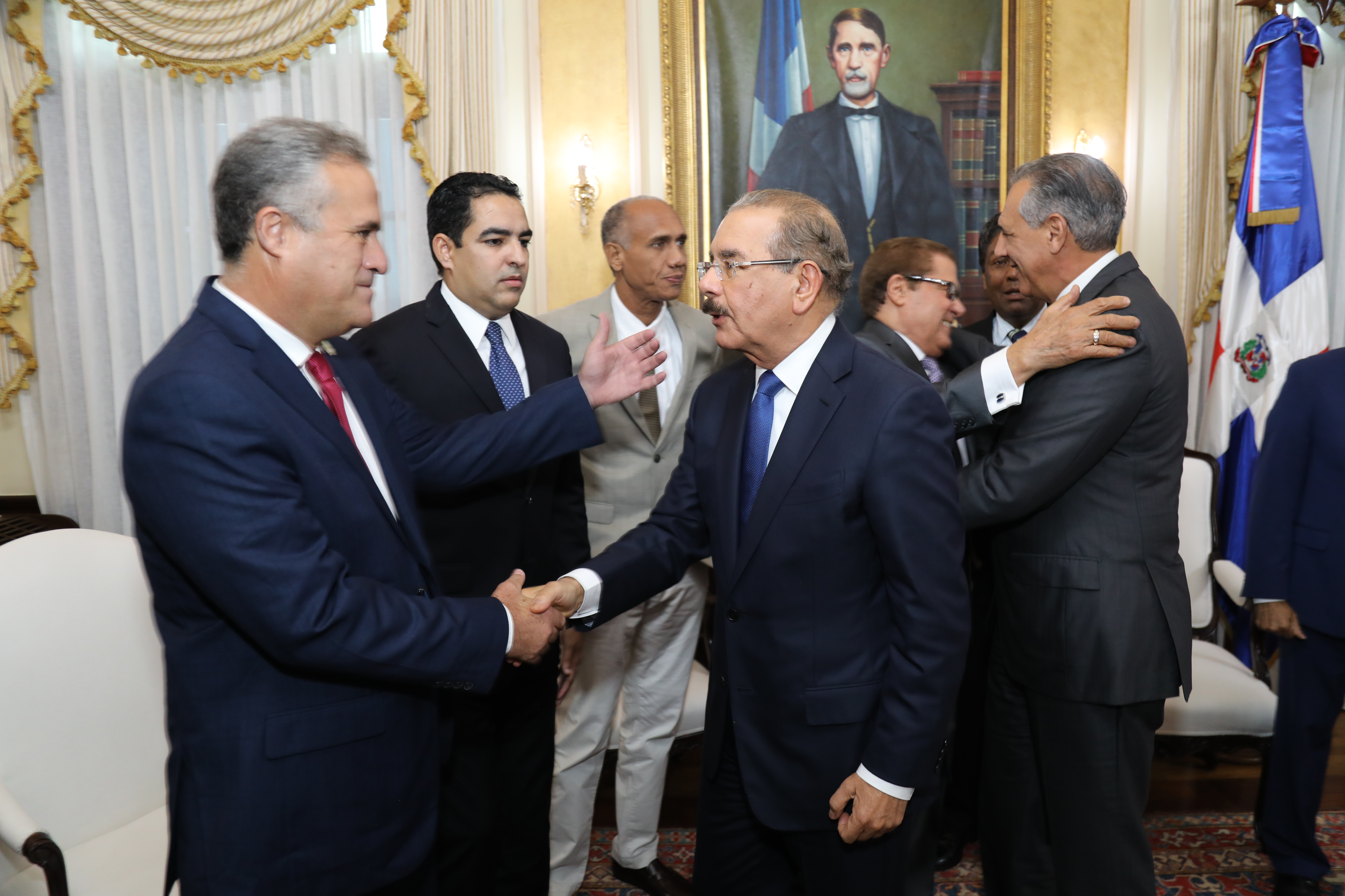 El presidente Danilo Medina conversa con Pedro Domínguez Brito, miembro del Consejo Directivo del Instituto Dominicano de las Telecomunicaciones (INDOTEL), uno de los funcionarios juramentados, mediante el decreto 317-19.