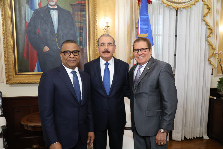 Ramón Antonio Pepín del Rosario, ministro de Obras Públicas y Comunicaciones; el presidente Danilo Medina, y Manuel Estrella Polanco, miembro del Consejo de Directores del Banco de Reservas.