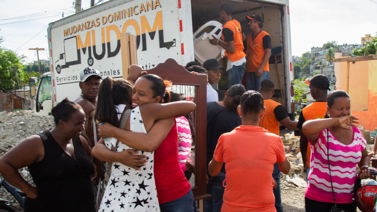Beneficiaros del proyecto de transformación urbana Nuevo Domingo Savio, en La Ciénaga, lucen felices durante su traslado de la zona de alto riesgo.