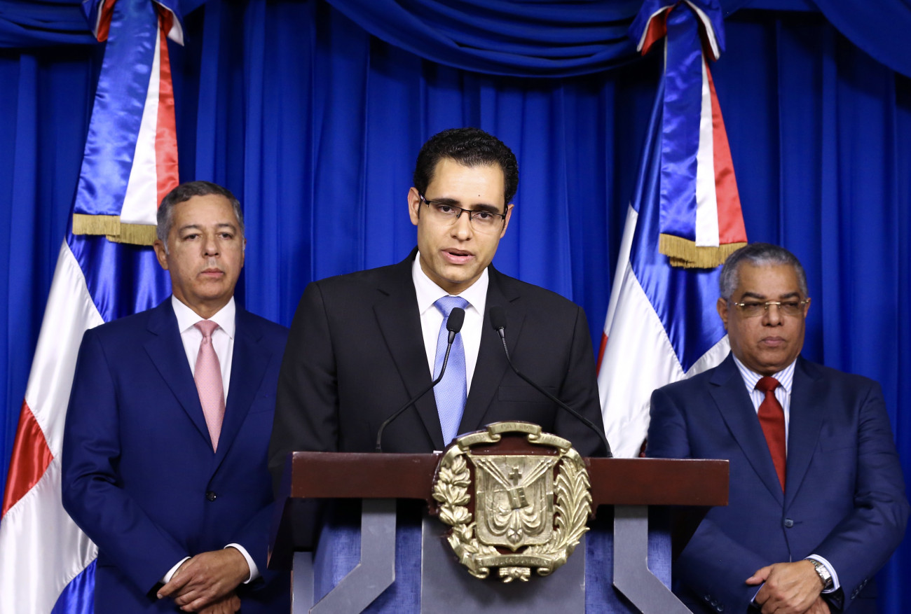 Rueda de prensa encabezada por los ministros de Hacienda, Donald Guerrero; de Economía, Planificación y Desarrollo; Juan Ariel Jiménez; así como del director general de Presupuesto, Luis Reyes, al finalizar la reunión.