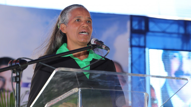 La profesora Nilsa Zayas fue quien pronunció las palabras de gracias al presidente Danilo Medina, por la entrega de los nuevos planteles.