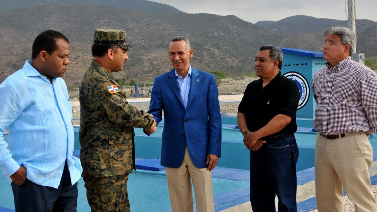 Rafael Luna Pichirilo, mayor general de las Fuerzas Armadas y encargado de la obra, mientras saluda al director del Instituto Nacional de Aguas Potables y Alcantarillado (INAPA), Alberto Holguín y acompañantes.