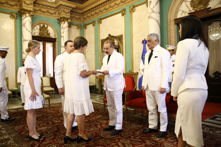 El presidente Danilo Medina recibe la nueva embajadora Extraordinaria y Plenipotenciaria del Reino de Bélgica, Jehanne Roccas, en el Salón de Embajadores del Palacio Nacional.