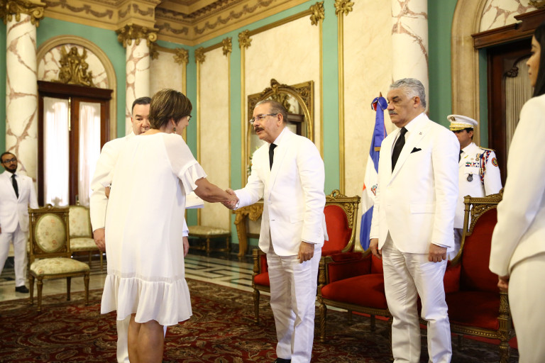 El presidente Danilo Medina recibe la nueva embajadora Extraordinaria y Plenipotenciaria del Reino de Bélgica, Jehanne Roccas, en el Salón de Embajadores del Palacio Nacional.