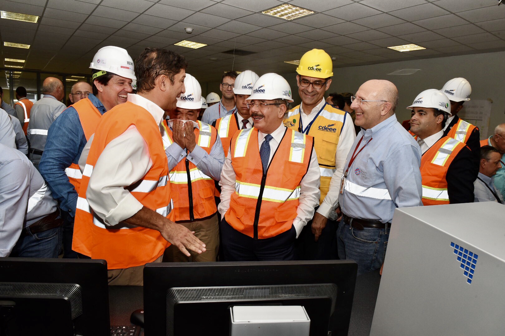 El presidente Danilo Medina con funcionarios de la Central Termoeléctrica Punta Catalina, donde dejó sincronizada la segunda unidad, en proceso de pruebas.