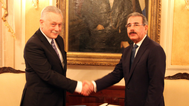 El presidente Medina y el embajador Vladimir Zaemsky, embajador ruso en Venezuela, al ser recibido en el Palacio Nacional, donde hablaron sobre el fortalecimiento de los vínculos entre República Dominicana y la Federación Rusa.