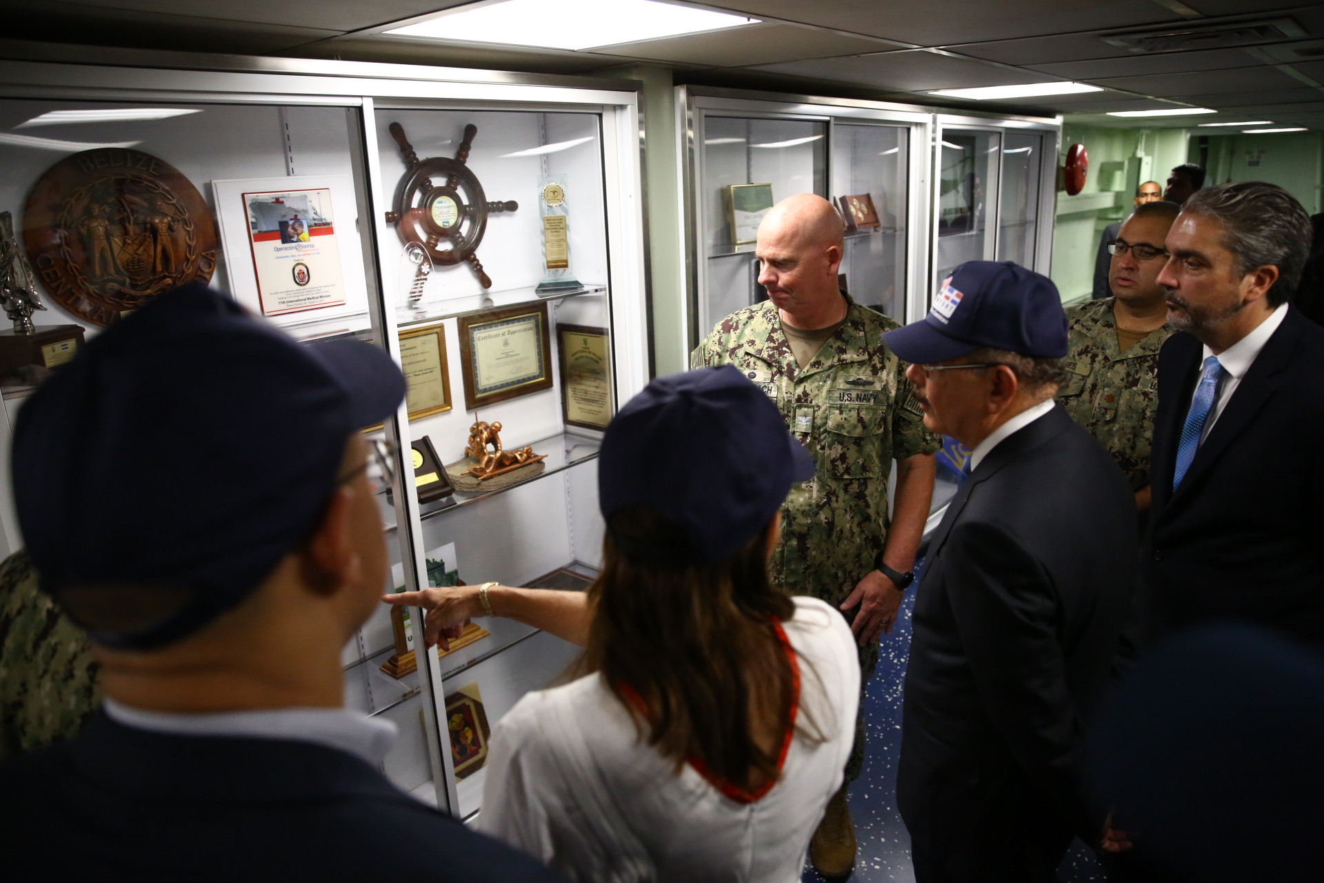 Presidente Danilo Medina acompañado del capitán del USNS Comfort, capitán Brian J. Debold, y por la embajadora de los Estados Unidos en el país, Robin Bernstein, durante recorrido por el buque hospital Military Sealift Command USNS Comfort, de Estados Unidos. Foto: Romelio Montero/Presidencia República Dominicana Enlace noticia: presidencia.gob.do/noticias/danilo-medina-visita-buque-ho...