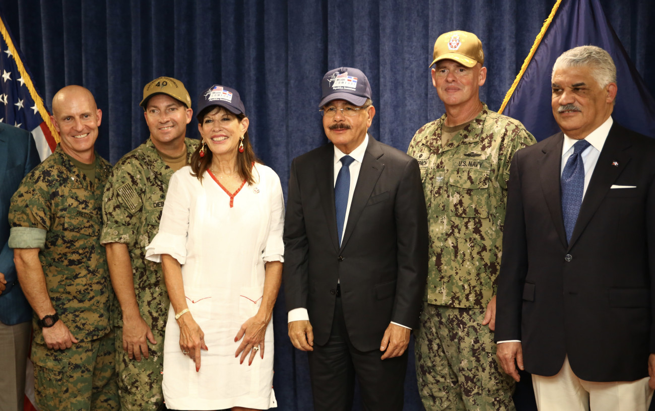 El presidente Danilo Medina, junto a la embajadora de los Estados Unidos en el país, Robin Bernstein; el canciller Miguel Vargas Maldonado; el capitán Brian J. Debold, y médicos del buque hospital Military Sealift Command USNS Comfort, de Estados Unidos.