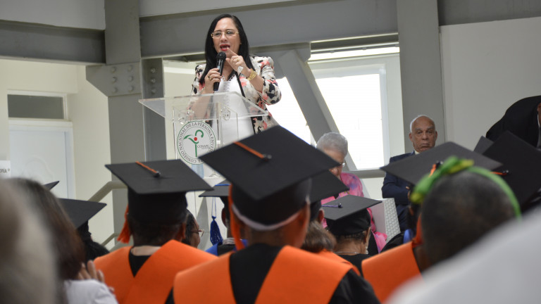 Acto de graduación del Centro de Atención Integral para Adultos Mayores de Ciudad Juan Bosch, encabezado por la directora ejecutiva del Conape, Nathali María, con ocasión de su primer aniversario. Foto: Presidencia República Dominicana Enlace noticia: presidencia.gob.do/noticias/centro-de-atencion-integral-p...