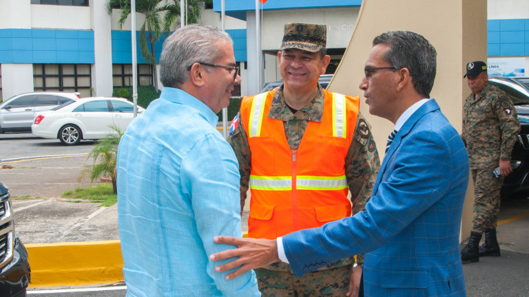 El viceministro de Producción y Desarrollo Comunitario del Ministerio Administrativo de la Presidencia, Juan Pumarol, con el director ejecutivo de la Defensa Civil, general Rafael Antonio Carrasco Paulino, en compañía del senador por Montecristi, Heinz Siegfried Vieluf Carrera, durante la entrega del vehículo.