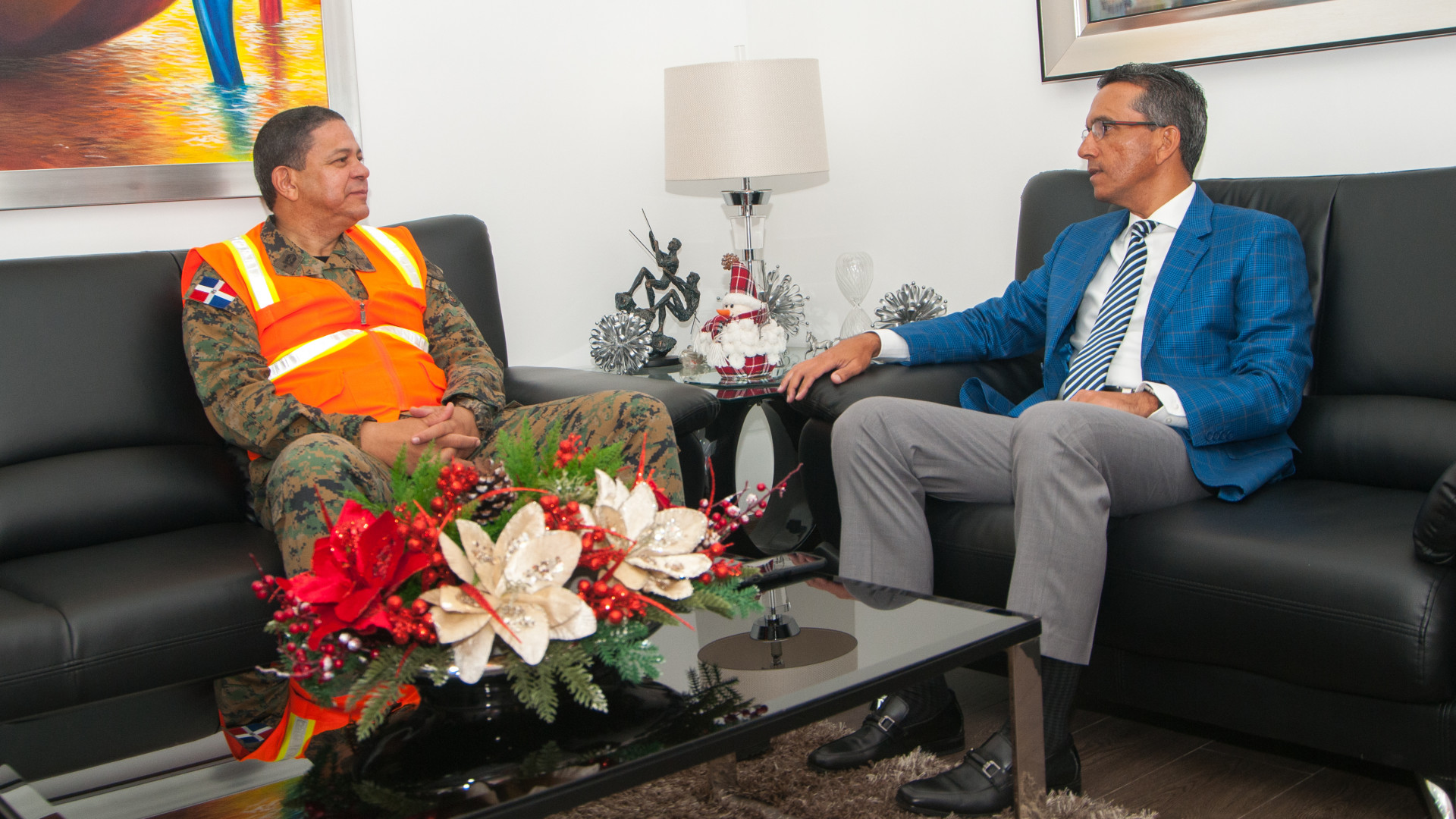 El viceministro de Producción y Desarrollo Comunitario del Ministerio Administrativo de la Presidencia, Juan Pumarol, con el director ejecutivo de la Defensa Civil, general Rafael Antonio Carrasco Paulino.