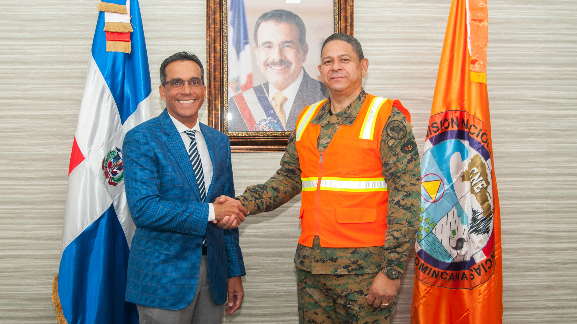 El viceministro de Producción y Desarrollo Comunitario del Ministerio Administrativo de la Presidencia, Juan Pumarol, con el director ejecutivo de la Defensa Civil, general Rafael Antonio Carrasco Paulino.