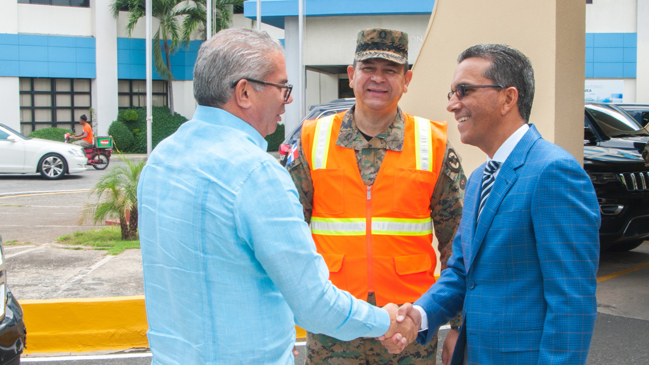 El viceministro de Producción y Desarrollo Comunitario del Ministerio Administrativo de la Presidencia, Juan Pumarol, con el director ejecutivo de la Defensa Civil, general Rafael Antonio Carrasco Paulino, en compañía del senador por Montecristi, Heinz Siegfried Vieluf Carrera, durante la entrega del vehículo.