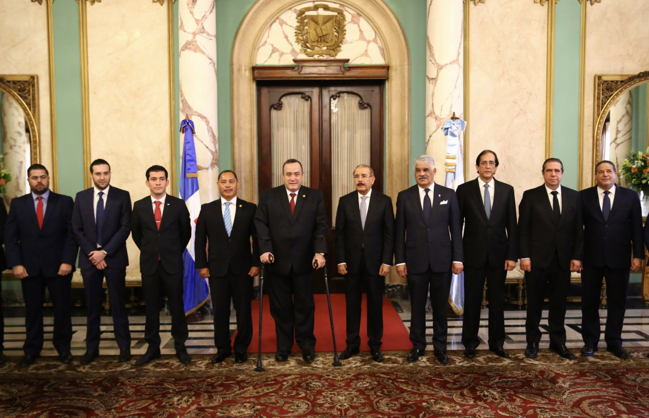 El presidente de la República, Danilo Medina, junto a Alejandro Giammattei, presidente electo de la República de Guatemala, su comitiva, y la delegación dominicana integrada por Gustavo Montalvo, ministro de la Presidencia; canciller Miguel Vargas Maldonado; Francisco Javier García, ministro de Turismo; Carlos Pared Pérez, asistente especial del presidente de la República, y Alexis Medina.