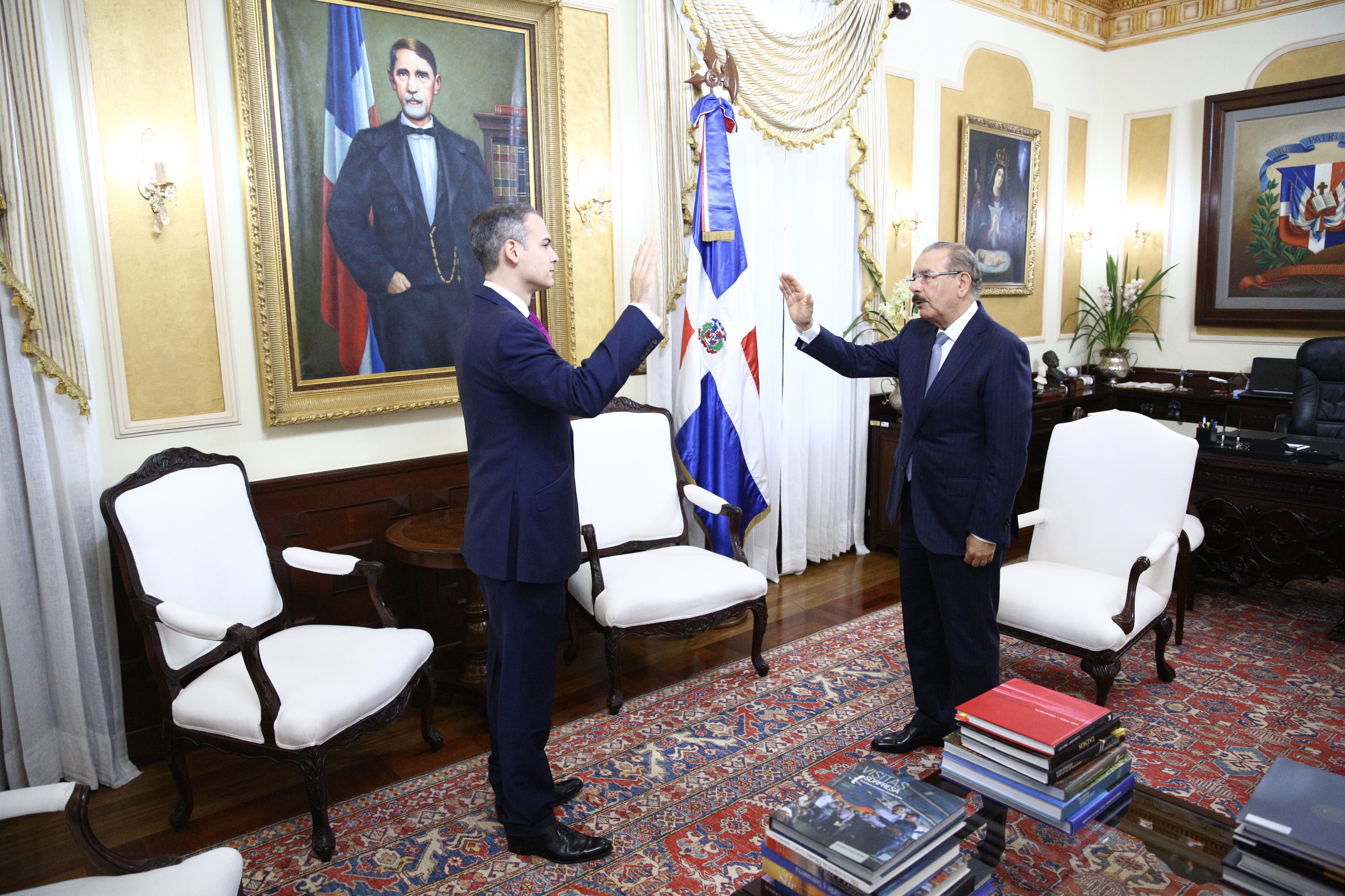 El presidente Danilo Medina mientra juramenta a Josué Antinoe Fiallo, como nuevo representante permanente de la República Dominicana ante la Organización de Estados Americanos (OEA).