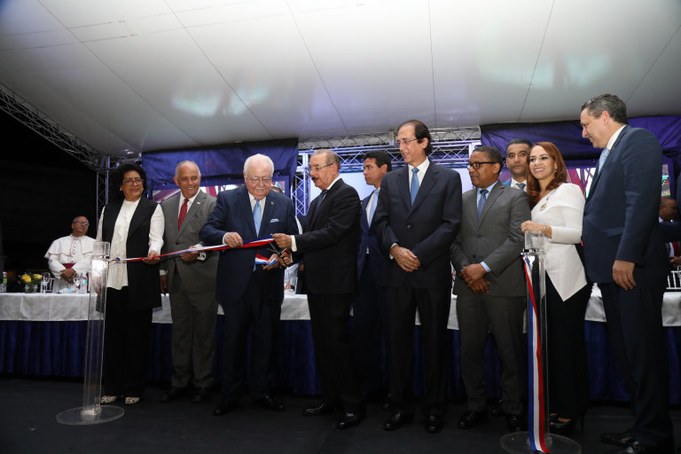 El presidente Danilo Medina y el ministro de Energía y Minas, Antonio Isa Conde, cortan la cinta para dejar inaugurada la obra. Junto a ellos, el ministro de la Presidencia, Gustavo Montalvo; la senadora Cristina Lizardo, otras autoridades municipales y diferentes personalidades.