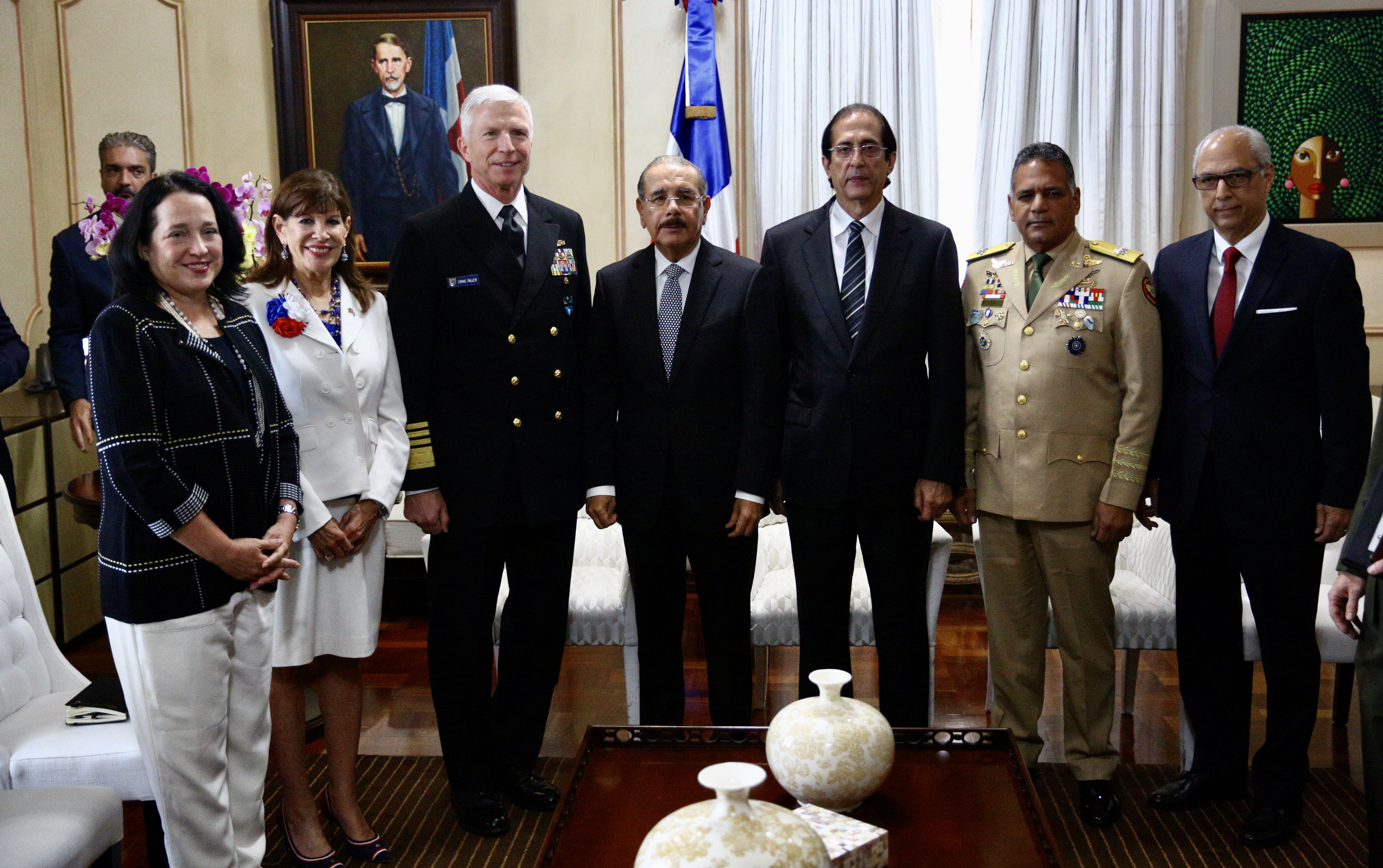 El presidente Danilo Medina con el jefe del Comando Sur de Estados Unidos, almirante Craig S. Faller; la embajadora de ese hermano país, Robin S. Bernstein, y acompañantes, durante reunión en Palacio Nacional.