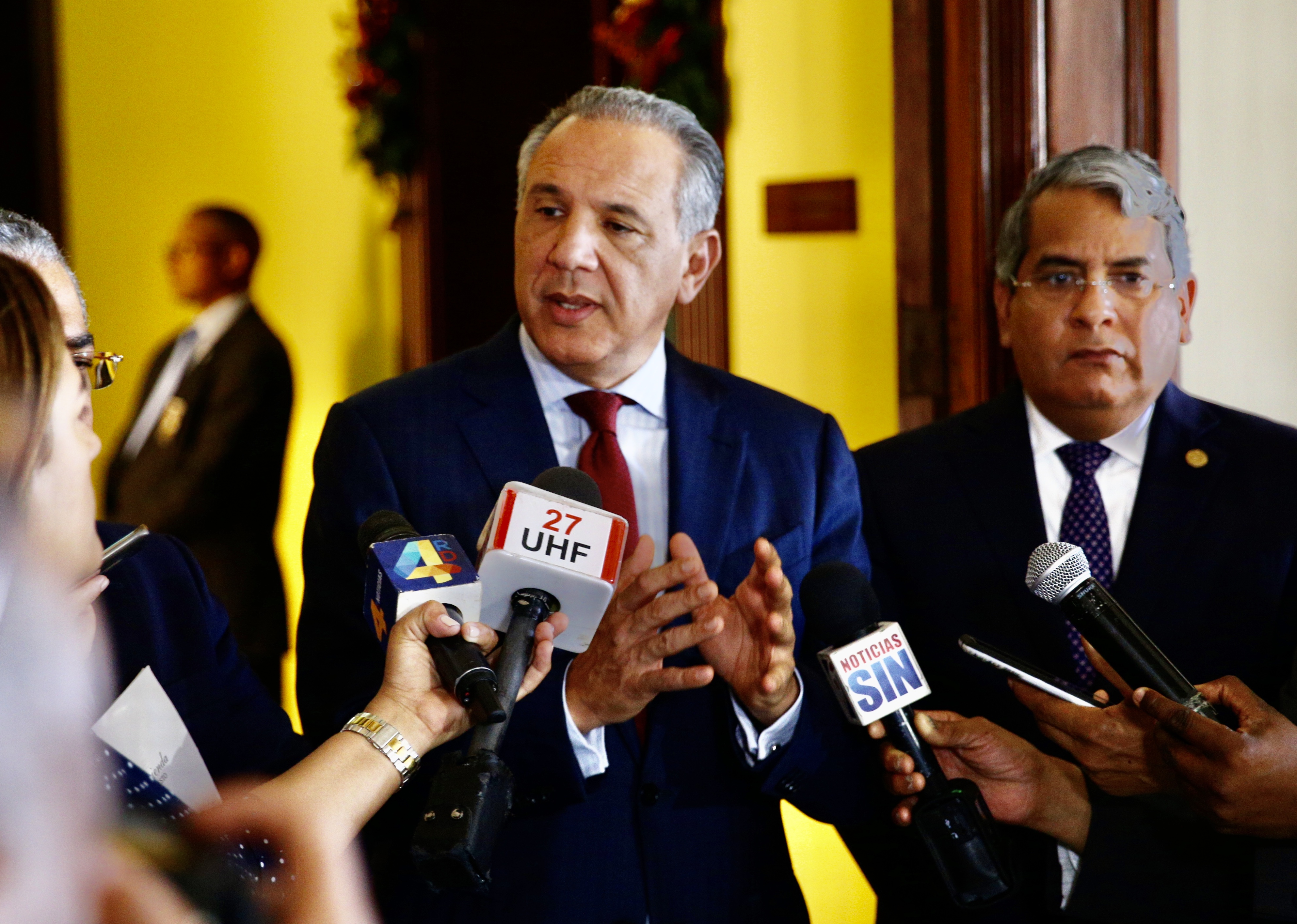 Declaraciones del ministro administrativo de la Presidencia, José Ramón Peralta, donde anunció para el próximo 5 de diciembre el inicio del pago del sueldo 13 a los servidores de instituciones centralizadas y descentralizadas del Estado. Palacio Nacional.