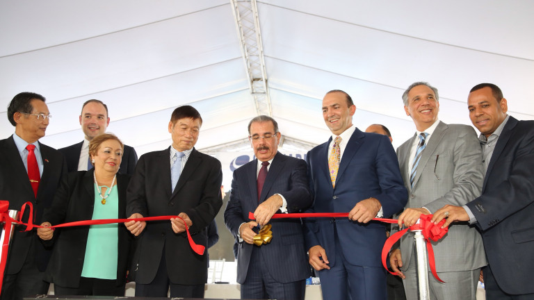 Presidente Danilo Medina, junto a ejecutivos del grupo Hong Fu y la empresa VF Corporation, y funcionarios del gobierno, durante el tradicional corte de cinta para dejar en funcionamiento la nueva empresa de zona franca Sun Jade International, con una inversión inicial de 35 millones de dólares, y que tiene como objetivo producir 20 millones de pares de tenis que serán destinados al mercado local y la exportación.