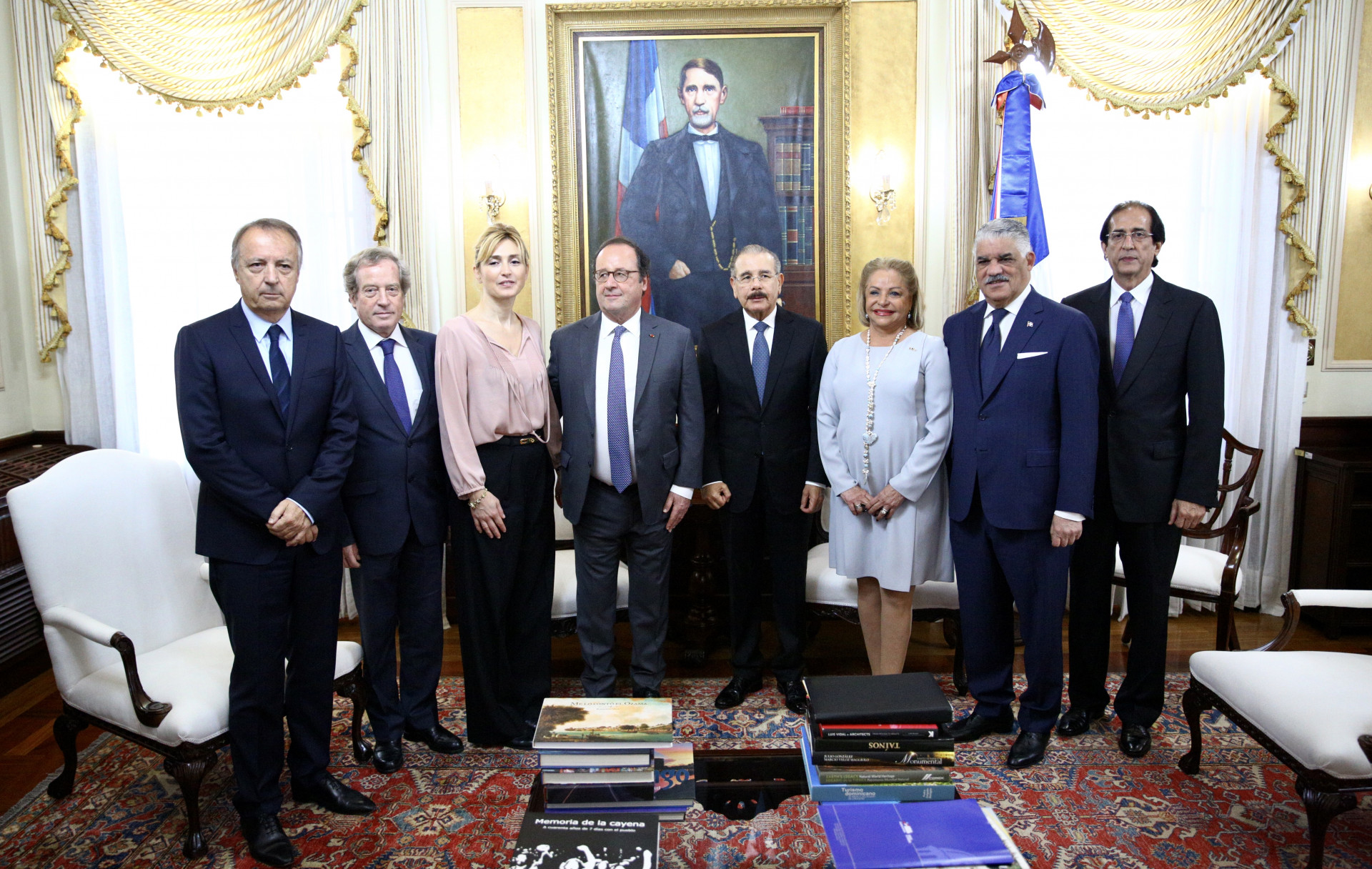 El presidente Danilo Medina con el expresidente de la República Francesa François Hollande, su esposa Juliet Gayet; el embajador Didier Lopinot; la embajadora dominicana en Francia, Rosa Hernández de Grullón; el expresidente del Senado, Jean Pierre Bel; el ministro de la Presidencia, Gustavo Montalvo, y el canciller Miguel Vargas. Foto: Romelio Montero/Presidencia República Dominicana Enlace noticia: presidencia.gob.do/noticias/presidente-danilo-medina-reci...