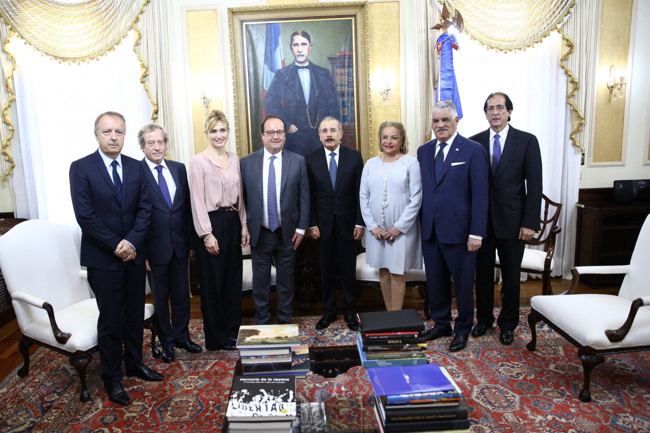 El presidente Danilo Medina con el expresidente de la República Francesa François Hollande, su esposa Juliet Gayet; el embajador Didier Lopinot; la embajadora dominicana en Francia, Rosa Hernández de Grullón; el expresidente del Senado, Jean Pierre Bel; el ministro de la Presidencia, Gustavo Montalvo, y el canciller Miguel Vargas.