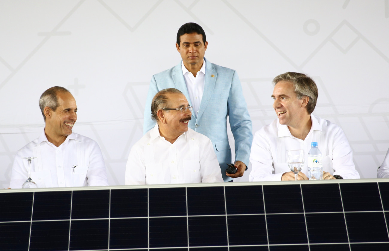 El presidente de AES Dominicana, Edwin de los Santos; el presidente Danilo Medina, y Juan Ignacio Rubiolo, presidente para AES México, Centroamérica y El Caribe. Junto a ellos, el mayor general Adán Cáceres, jefe del Cuerpo de Seguridad Presidencial.