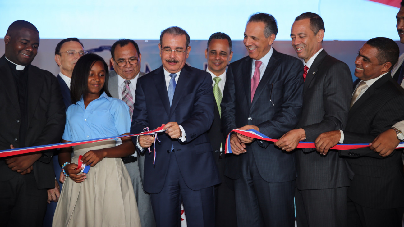 El presidente Danilo Medina realiza el corte de cinta para dejar inaugurada las 74 nuevas aulas.