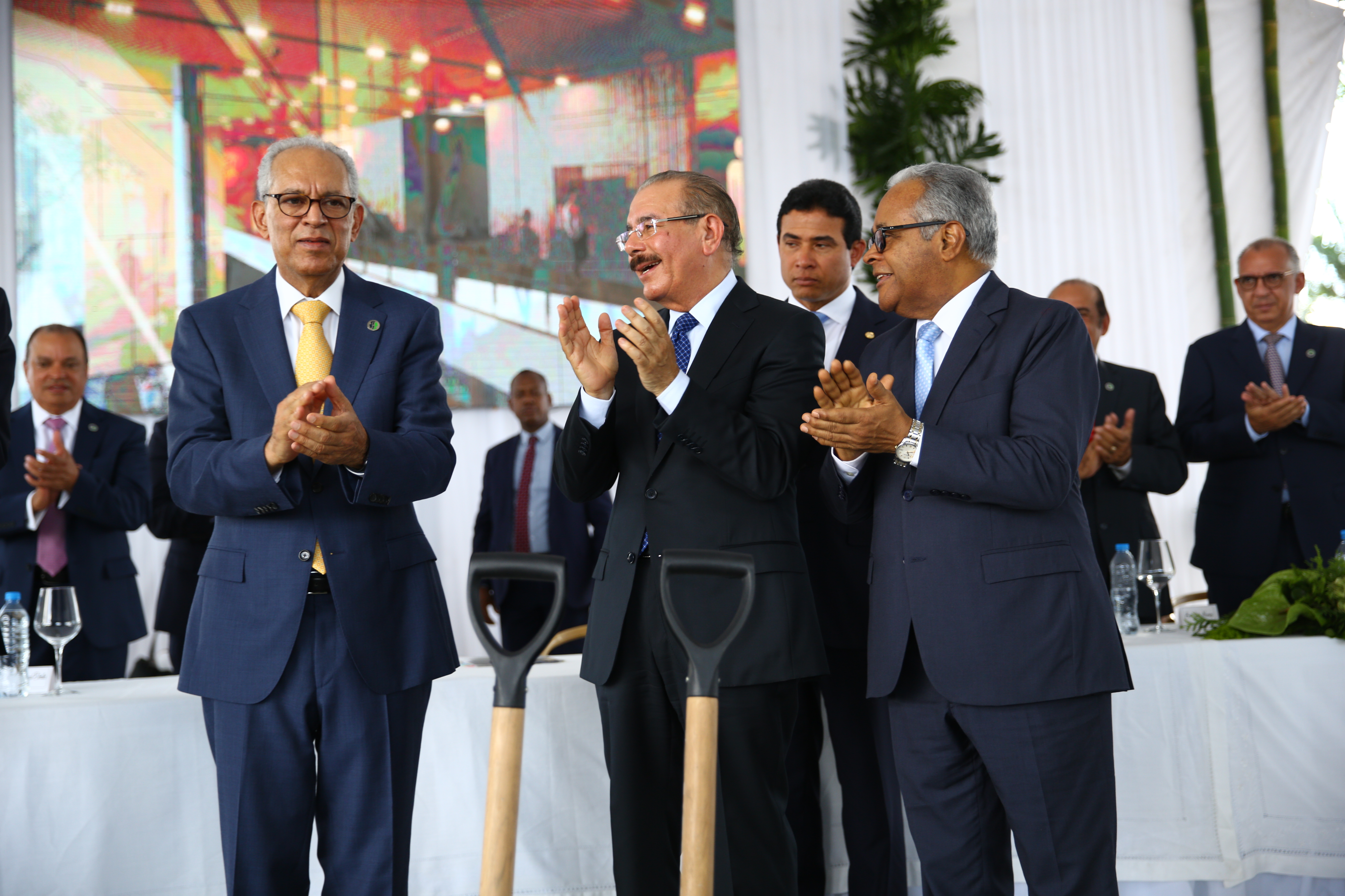 Rafael Sánchez Español, presidente del Consejo de Administración del HOMS, el presidente Danilo Medina y el ministro de Salud Pública, Rafael Sánchez Cárdenas, durante el primer palazo para la nueva Torre Profesional-Hotel, en Santiago.
