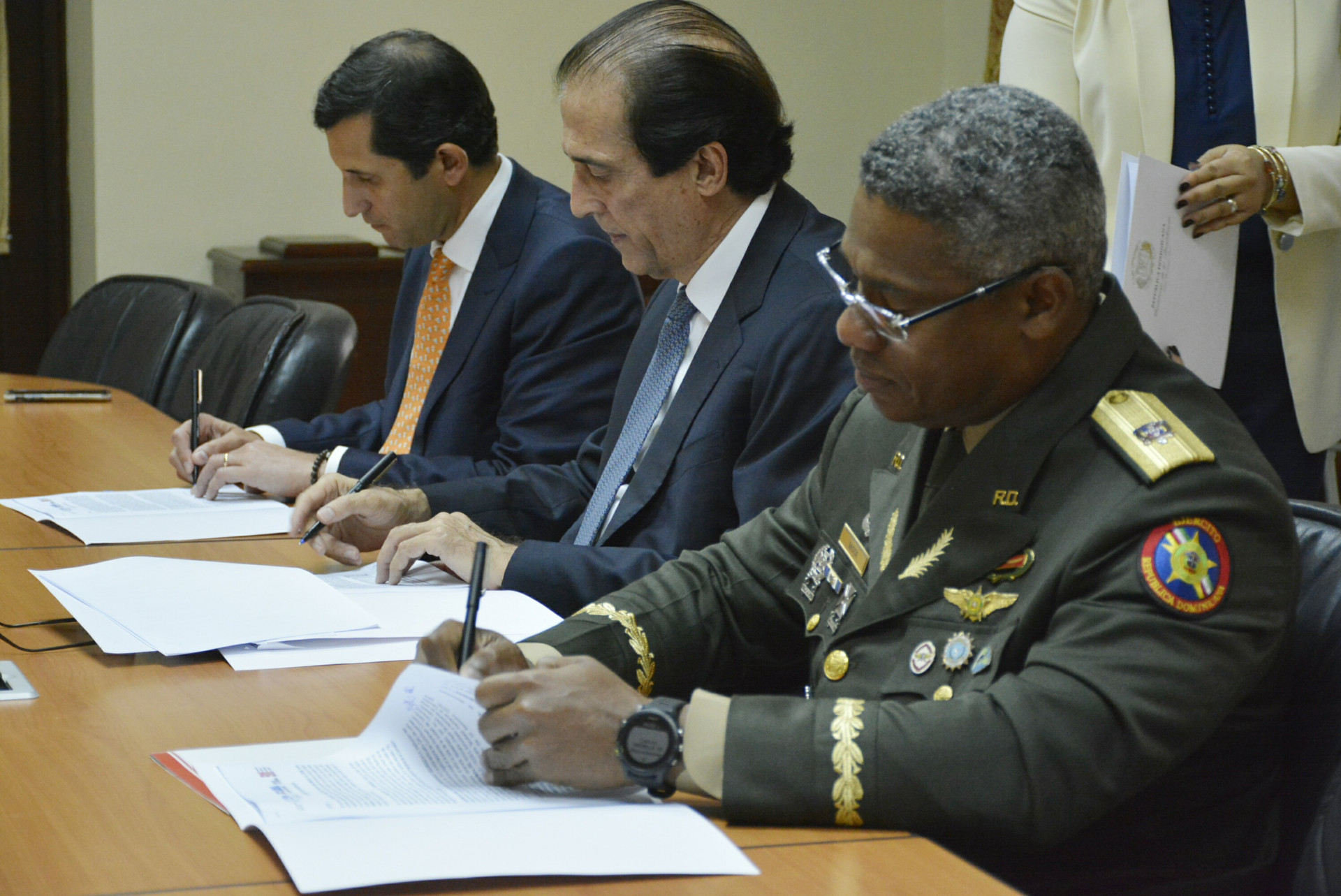 El ministro de la Presidencia, Gustavo Montalvo, el director ejecutivo del CEPM, Roberto Herrera, y el director del Sistema 911, Vicente Mota, durante la firma en el Salón Los Trinitarios, del Palacio Nacional.