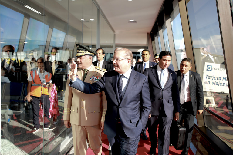 Presidente Danilo Medina acompañado del ministro de Defensa, teniente general ERD, Rubén Darío Paulino Sem, quien acudió a recibirlo a su regreso al país, por el Aeropuerto Internacional Las Américas José Francisco Peña Gómez.
