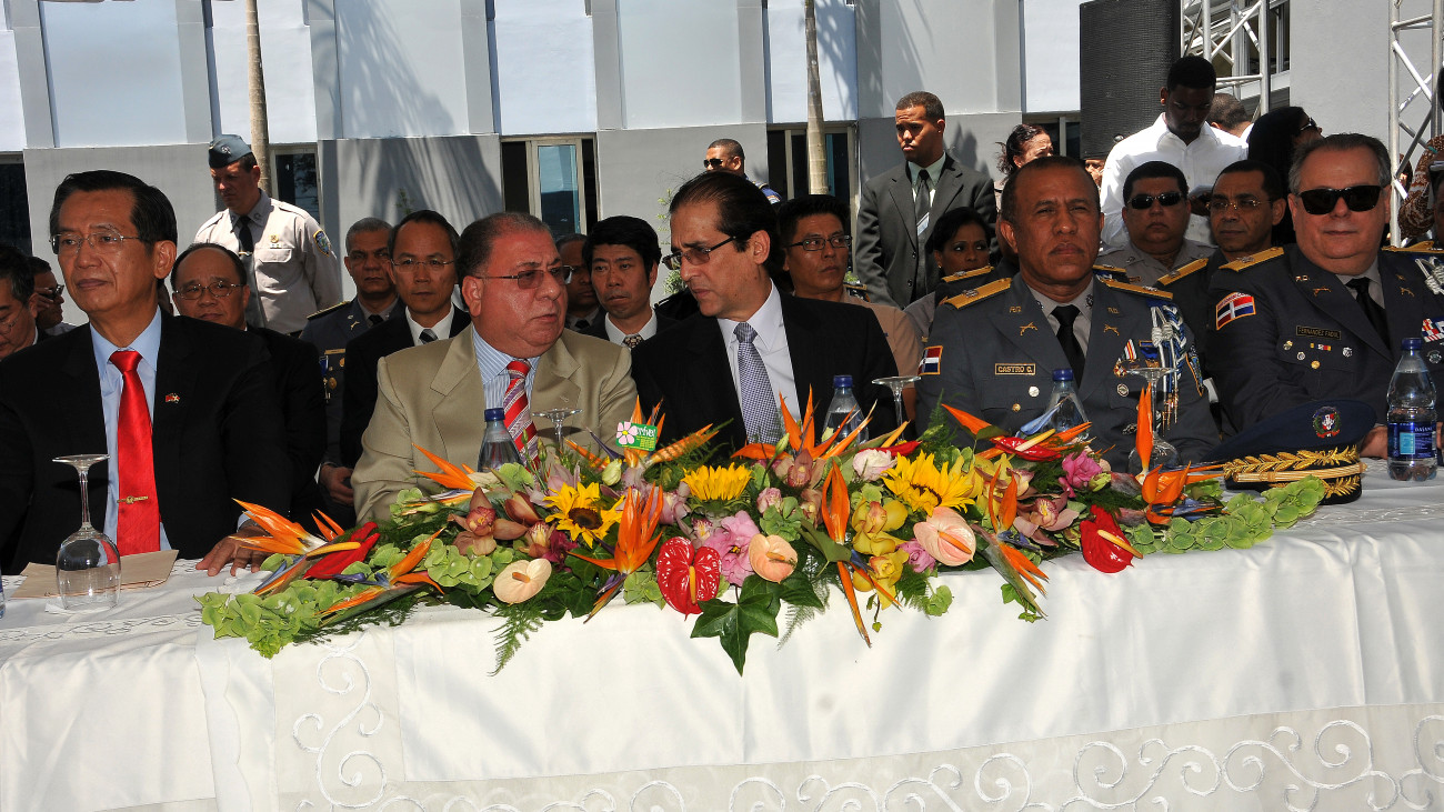 De izquierda a derecha, Tomás, Ping-Fu Houe, embajador de Taiwán; Jose Ramón Fadul, ministro de Interior y Policía; Gustavo Montalvo, ministro de la Presidencia; mayor general Manuel Castro Castillo, jefe de la Policial Nacional, y el mayor general, José Sigfredo Fernández Fadul, presentes durante acto de entrega.