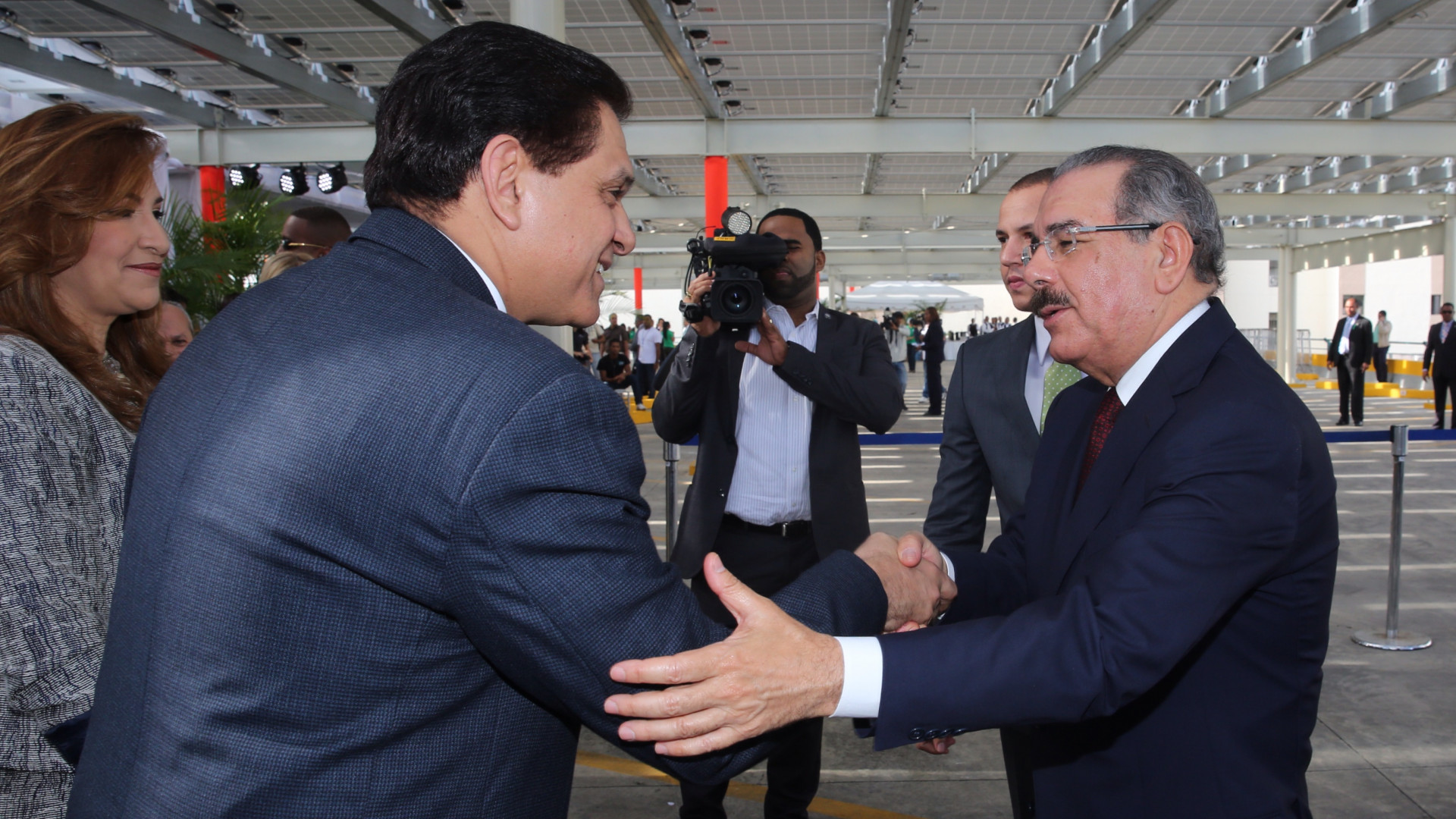 Participación del presidente de la República, Danilo Medina Sánchez, al ser recibido por Daniel Rivera, presidente del Consejo de Administración del Centro Unión Médica del Norte, donde ambos presidirán el acto inaugural de las nuevas instalaciones.