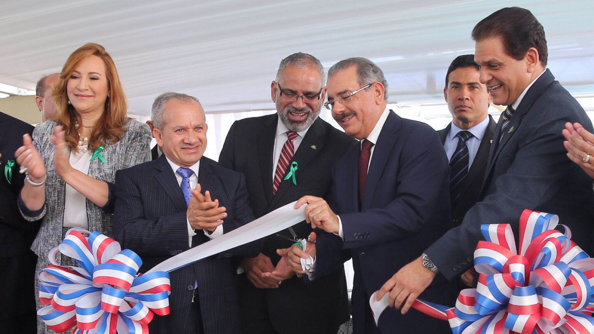 El presidente Danilo Medina Sánchez, durante recepción inaugural de la Planta Solar Fotovoltaica y de un Sistema de Climatización Central con agua helada, instalados en la clínica Unión Médica del Norte. Le acompañan, Daniel Rivera, presidente del Consejo de Administración del Centro Unión Médica del Norte; Aura Toribio, gobernadora de la provincia Santiago; y doctor Freddy Hidalgo Núñez, entre otros, presentes en la actividad