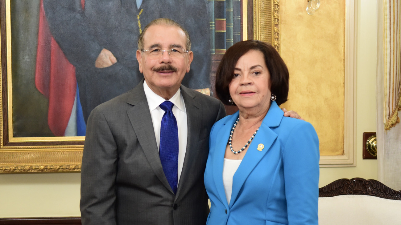 Presidente de la República, Danilo Medina, acompañado con María Elena Pérez, secretaria de la Junta Directiva.