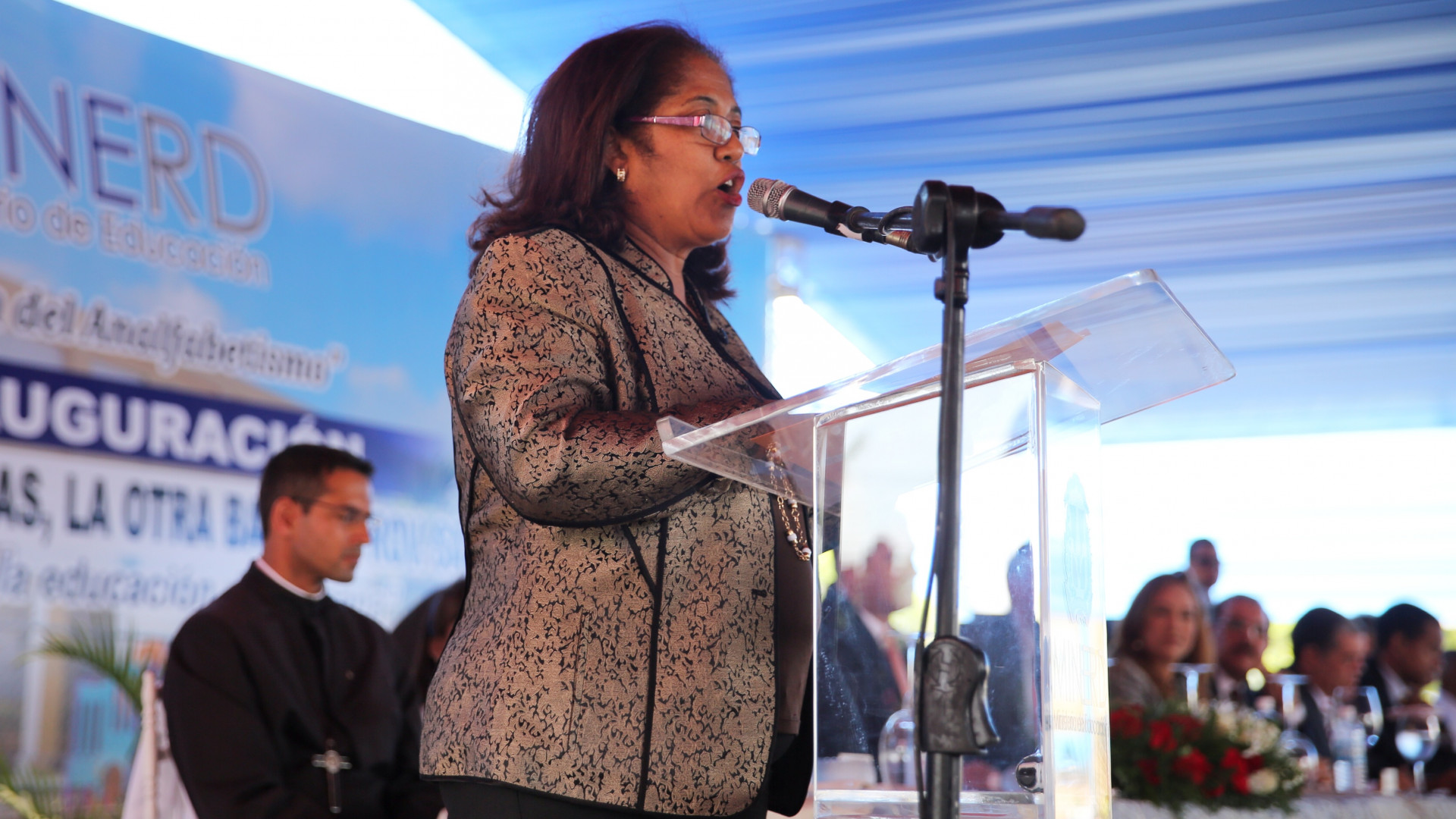 Brunilda Alemán, directora de la Escuela Básica Francisco Arias, durante su discurso, quien valoró el apoyo del presidente Danilo Medina en favor de la educación dominicana.