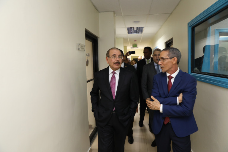 El presidente Danilo Medina y el director general del Canal 4RD, Ramón Tejada Read, durante recorrido por las nuevas instalaciones.