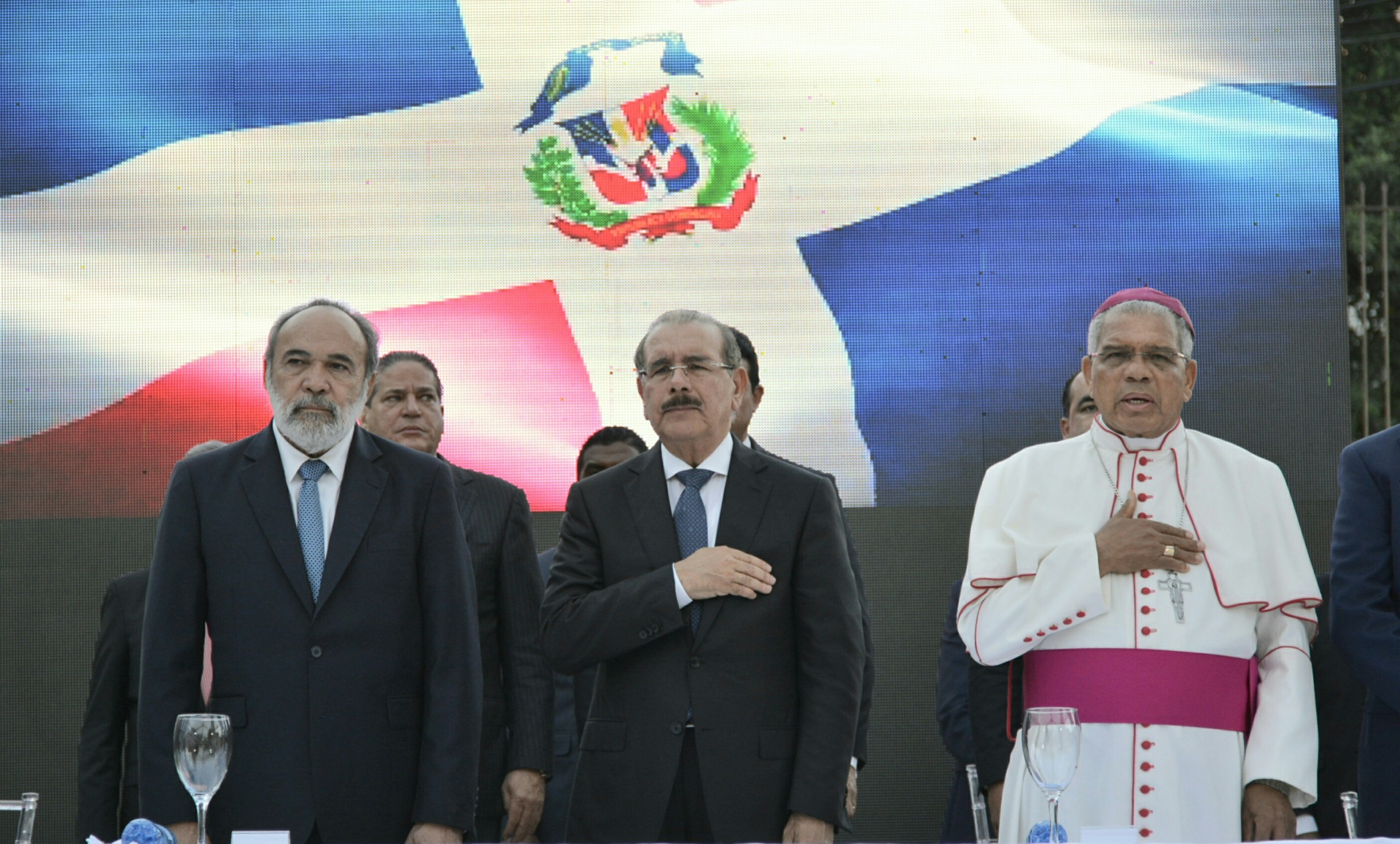 Director general de OISOE, Francisco Pagán, presidente Danilo Medina y monseñor Francisco Ozoria Acosta, arzobispo metropolitano de Santo Domingo, al encabezar la mesa principal del evento.