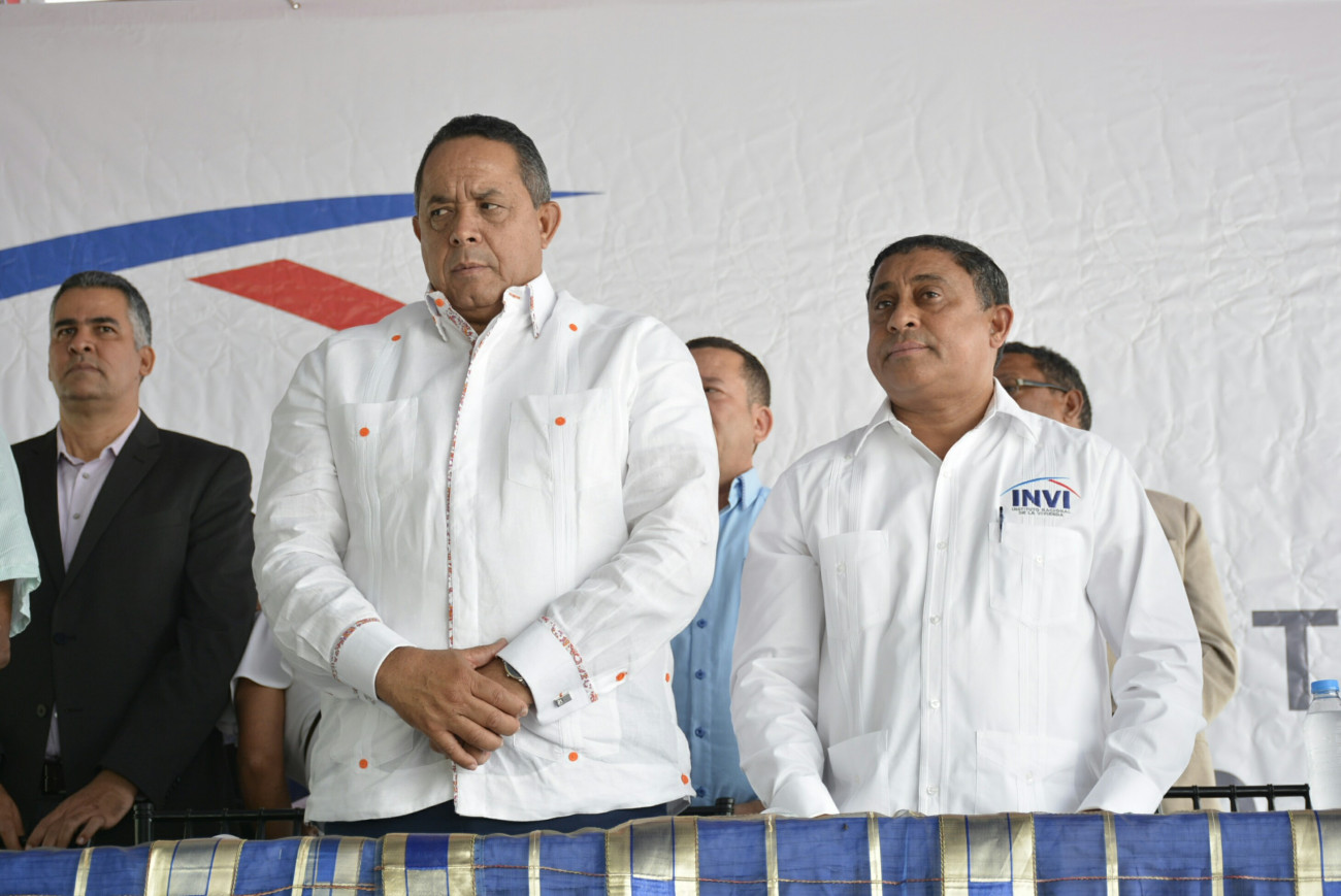 Acto de entrega de títulos definitivos de propiedad de apartamentos y locales comerciales a familias de Santo Domingo Este, encabezado por el director del INVI, Mayobanex Escoto.